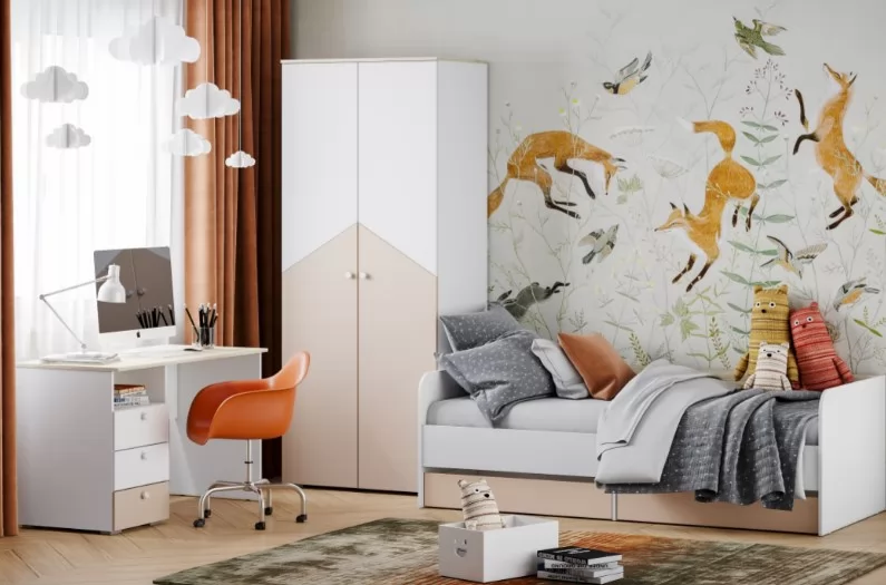 Особенности стиля детской «Банни» - это: светлые, спокойные оттенки в единой гамме. Скругленные ручки-кнопки не имеют острых граней. Ящики для хранения белья позволят навести порядок в комнате и расположить вещи. Скандинавская стилистика не любит загромождения мебелью. Только функциональность и практичность. Если правильно спланировать интерьер, в детской будет много места для хранения и пространства для игр. Фасады выполнены из МДФ с покрытием пленкой ПВХ.