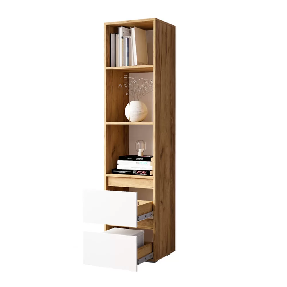 -модель представляет собой открытые полки, верхнее отделение с распашной дверцей и два нижних выдвигающихся ящика,