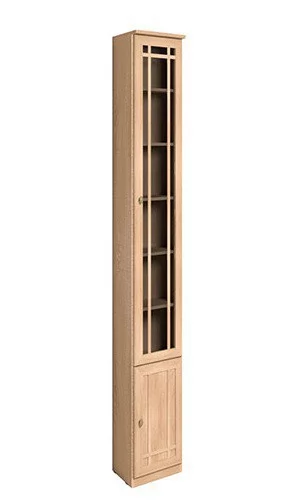 Высокий библиотечный шкаф со скосом влево гармонично завершает компоновку из шкафов библиотеки Sherlock, глубина зауженной части составляет 170 мм. Шкаф со скосом вправо называется Sherlock 35 Шкаф для книг. Библиотечный шкаф можно установить в комнату с высотой потолка не менее 240 см. Высота полок во всех шкафах для книг регулируется, для этого необходимо только установить полкодержатели на нужной высоте в подготовленные отверстия. Это позволит поставить на полки книги и альбомы разного формата. Нагрузка на одну полку не должна превышать 13 кг. Тонированное стекло защищает книги от вредного воздействия солнечных лучей и убережет их от пожелтения. Книжный шкаф обязательно крепится к стене за подвесы и межсекционной стяжкой с другими шкафами в наборе. Библиотека выпускается без выборки под плинтус, чтобы каждый мог прирезать плинтус индивидуально.