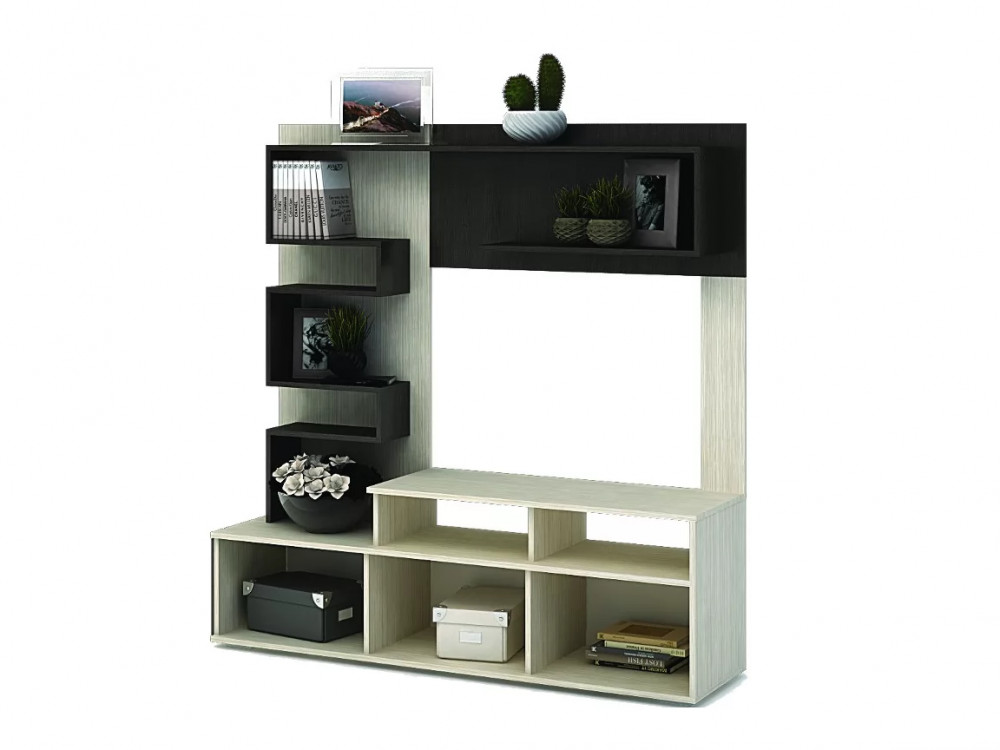 • Компактная и функциональная стенка для небольшой гостиной, выполненная в контрастных древесных расцветках.