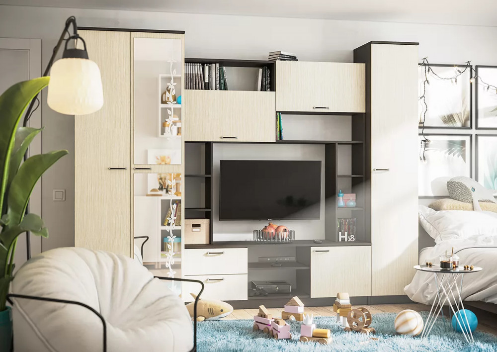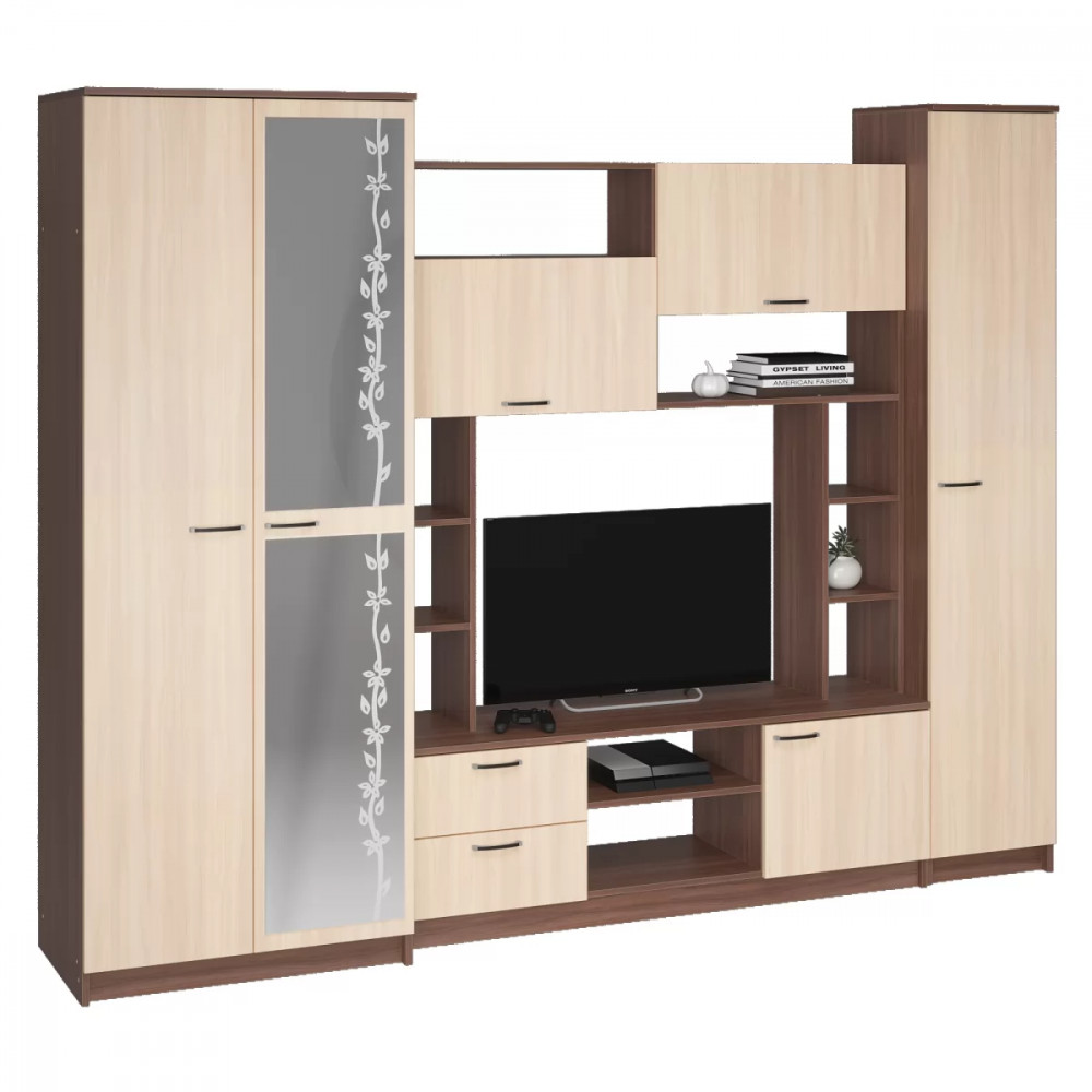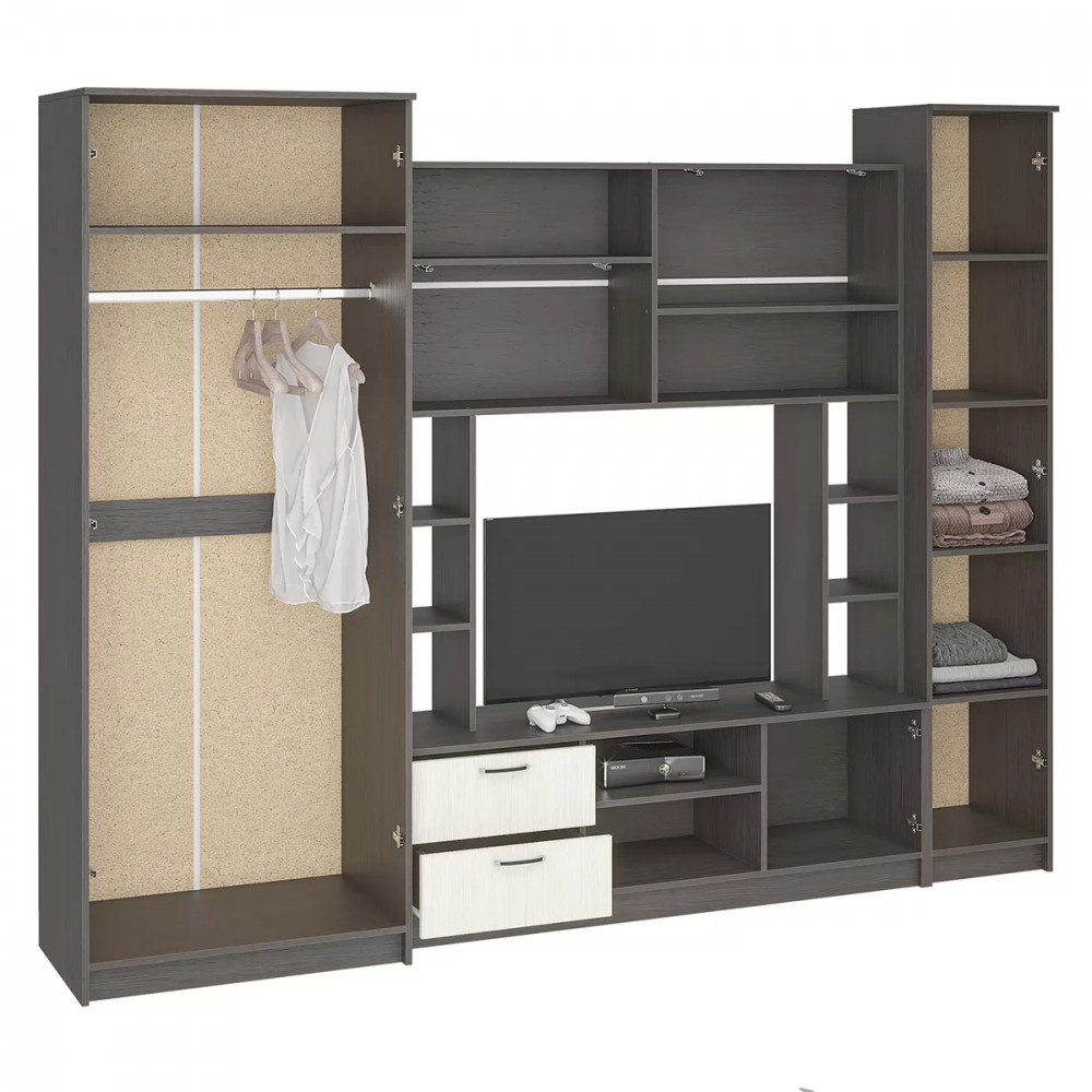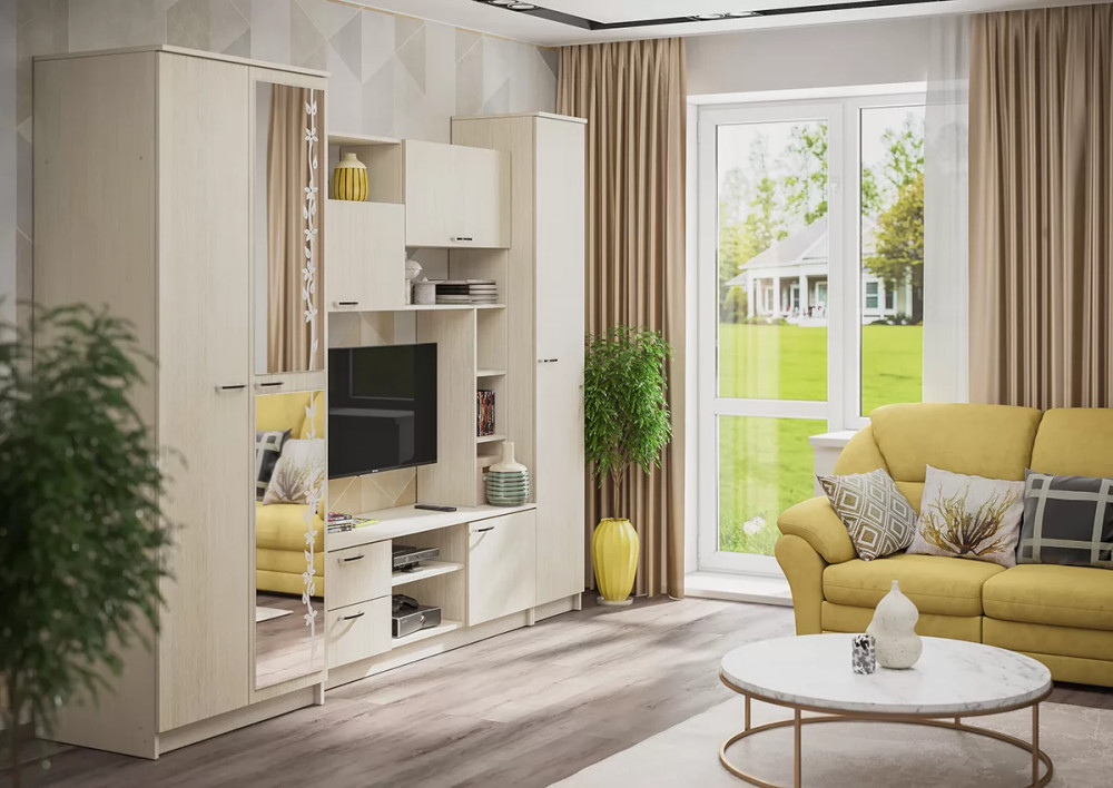 Многофункциональная и практичная гостиная выполнена в современном дизайне - Гостиная состоит из трёх модулей (шкаф платяной, шкаф бельевой, средняя секция), которые при желании можно устанавливать отдельно друг от друга, размещая в разных комнатах - Размер средней секции (ШхВхГ): 1500х1940х420 мм - Ниша под ТВ: 1000х800 мм, для моделей телевизоров с диагональю до 43" - Размеры платяного шкафа (ШхВхГ): 800х2100х530 мм - Платяной шкаф комплектуется горизонтальной штангой - Размеры пенала (ШхВхГ): 400х2100х430 мм - Зеркало 4 мм, с пескоструйной обработкой - Ручка пластик - Сборка универсальная, собирается как на левую, так и на правую сторону -Фасад можно перенавесить как на правую, так и на левую сторону