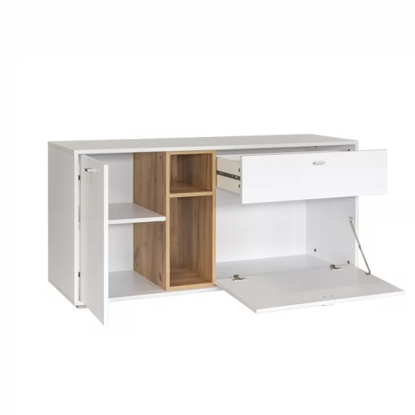 Тумба ТВ "Бэль" №10.91 разделена на три отделения. В левом за распашной дверкой находится полка, центральное также разделено на две ниши. Правое занимает выдвижной ящик и секция с откидной дверкой.