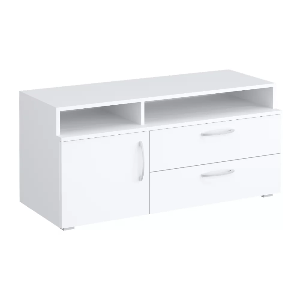 Современная низкая тумба под ТВ в универсальном белом цвете станет приятным акцентом вашей гостиной. Открытые полочки и закрытая зона для хранения - практичное сочетание. Выкатные ящики работают на шариковых направляющих полного выдвижения - тихие, надёжные и позволяющие увидеть всё пространство ящика целиком.