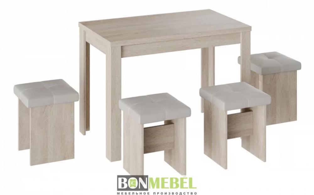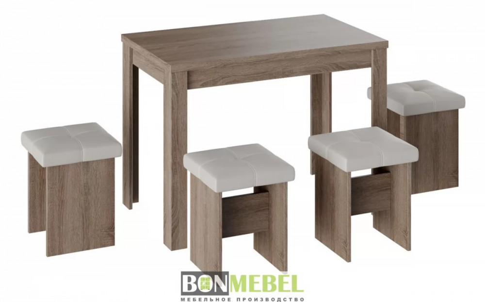 Обеденная группа с табуретами Тип-5 подойдет для оформления малогабаритных кухонь и квартир-студий. Лаконичный дизайн исполнения позволит комплекту сочетаться с любым современным интерьером.к. Обивка из экокожи устойчива к различным загрязнениям и не требует обработки специальными средствами. Мягкие сиденья табуретов имеют мягкое и упругое наполнение, что повышает уровень комфортабельности. Различные варианты расцветки помогут подобрать идеальный комплект. Для изготовления изделий используется прочная ЛДСП. Обивка табуретов выполнена из искусственной кожи.