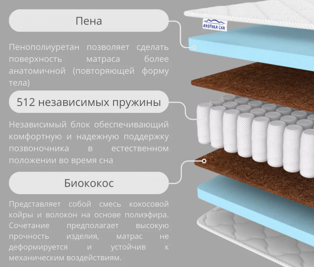 Состав: Пенополиуретан - 4 см/Био-кокос 1 см/Блок независимых пружин/Био-кокос 1 см/ Пенополиуретан - 4 см