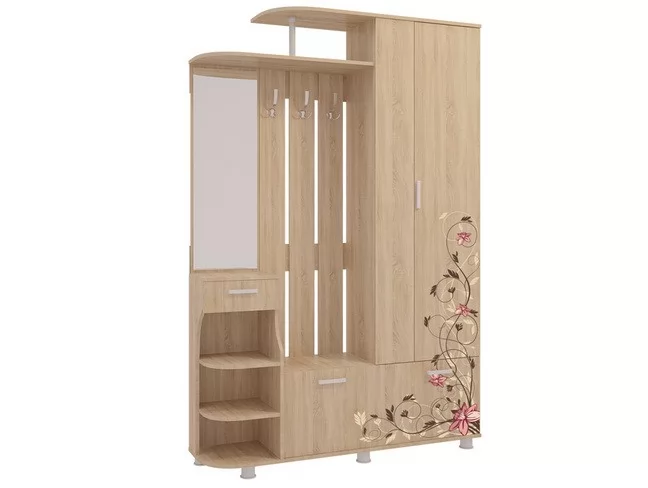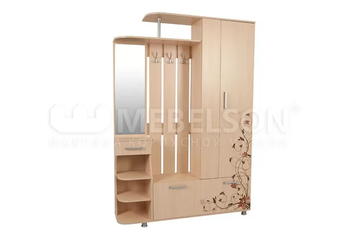 Состоит из: шкафа с выдвижной штангой, вешалки с крючками для одежды и сумок, обувницы, открытых полок, зеркала, полки для головных уборов, выдвижного ящика. Сборка универсальная, рисунок на фасадах не универсальный.
