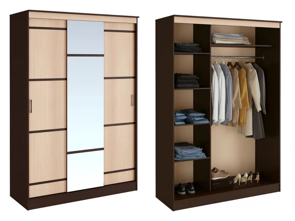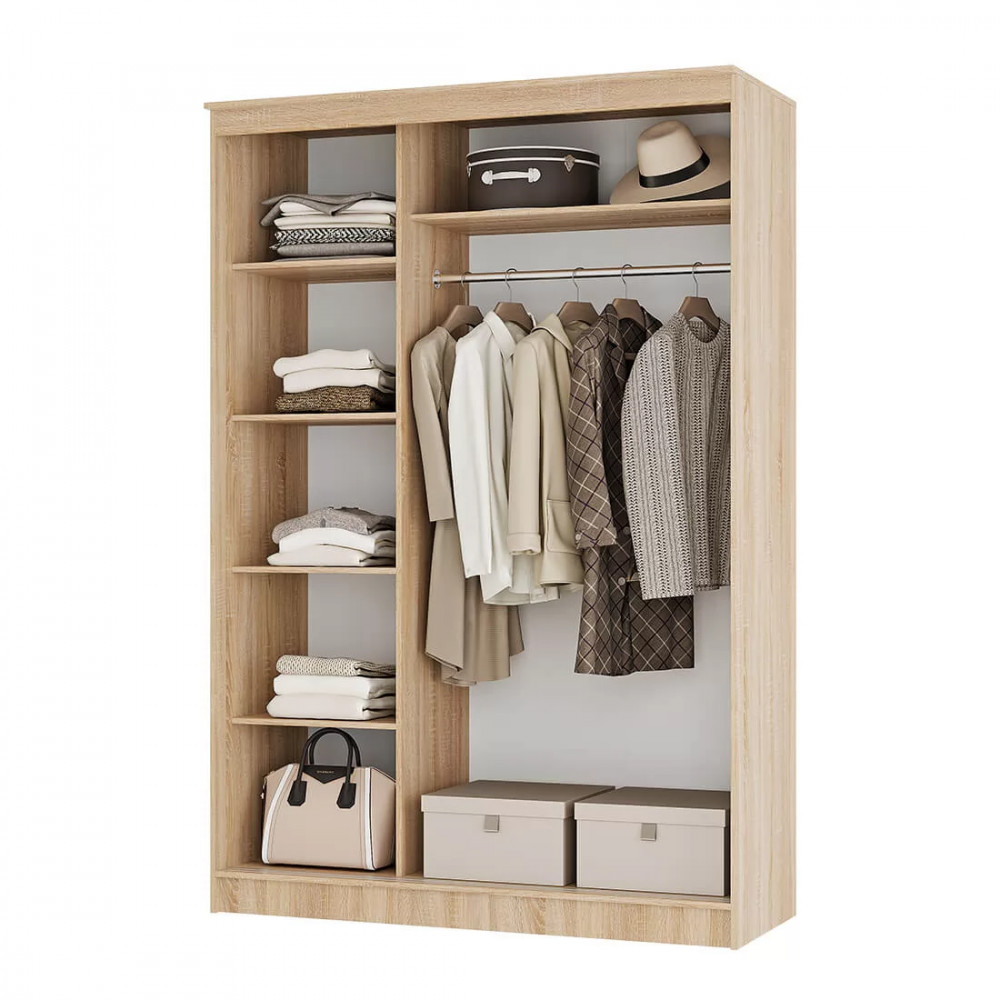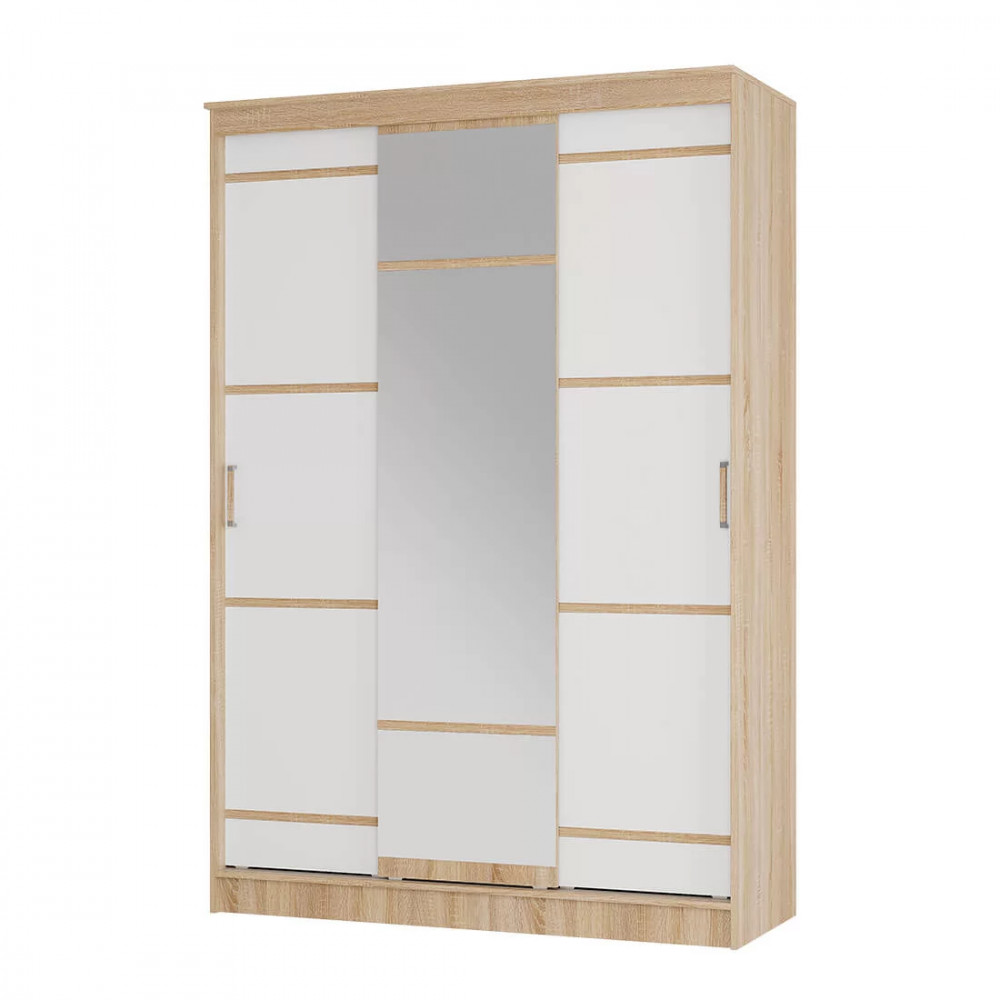 Он сделан из ЛДСП высокого качества в комбинации цветов сонома и белый, раздвижные дверцы декорированы темными полосами и дополнены удобными ручками, центральная створка – полностью зеркальная. Внутри модель содержит все необходимые зоны для хранения одежды и обуви: большое отделение для плечиков, а также полки и ниши для остальных вещей.
