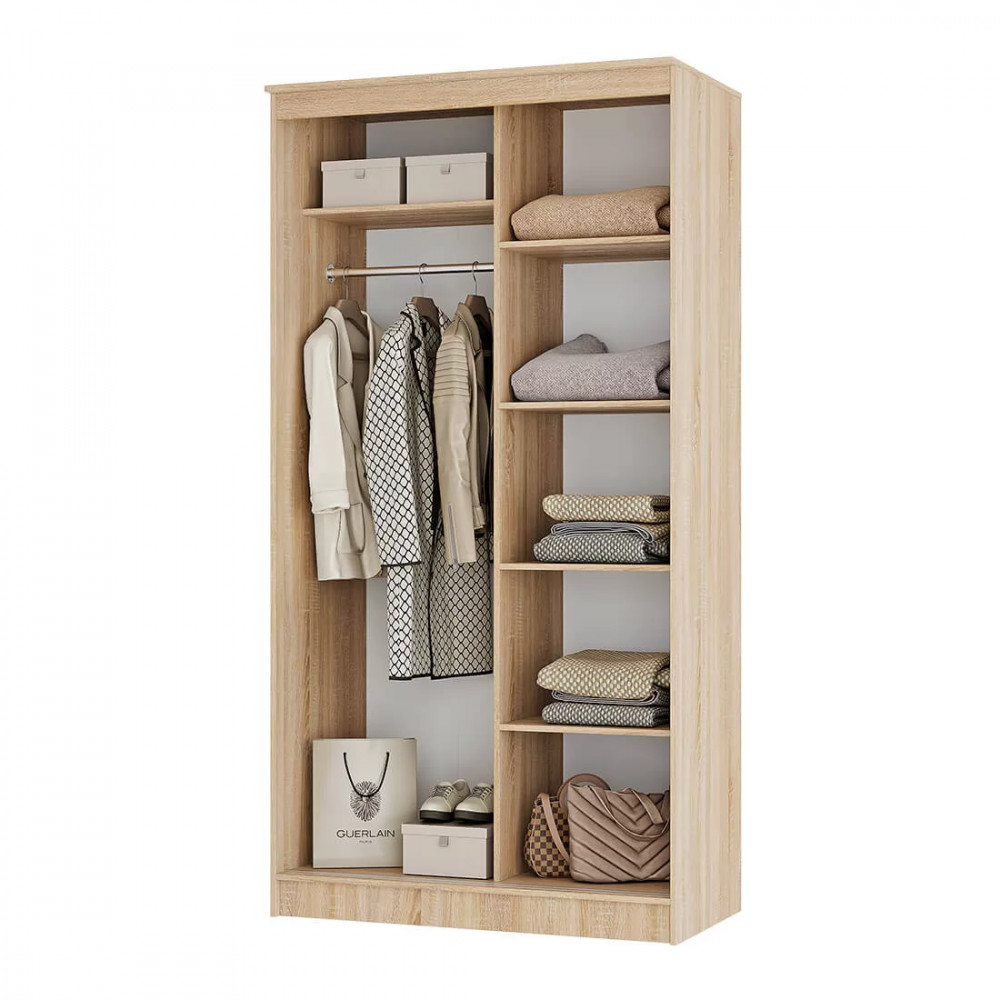 Он сделан из ЛДСП высокого качества в комбинации цветов сонома и белый, раздвижные дверцы декорированы темными полосами и дополнены удобными ручками. Внутри модель содержит все необходимые зоны для хранения одежды и обуви: отделение для плечиков, а также полки и ниши для остальных вещей.