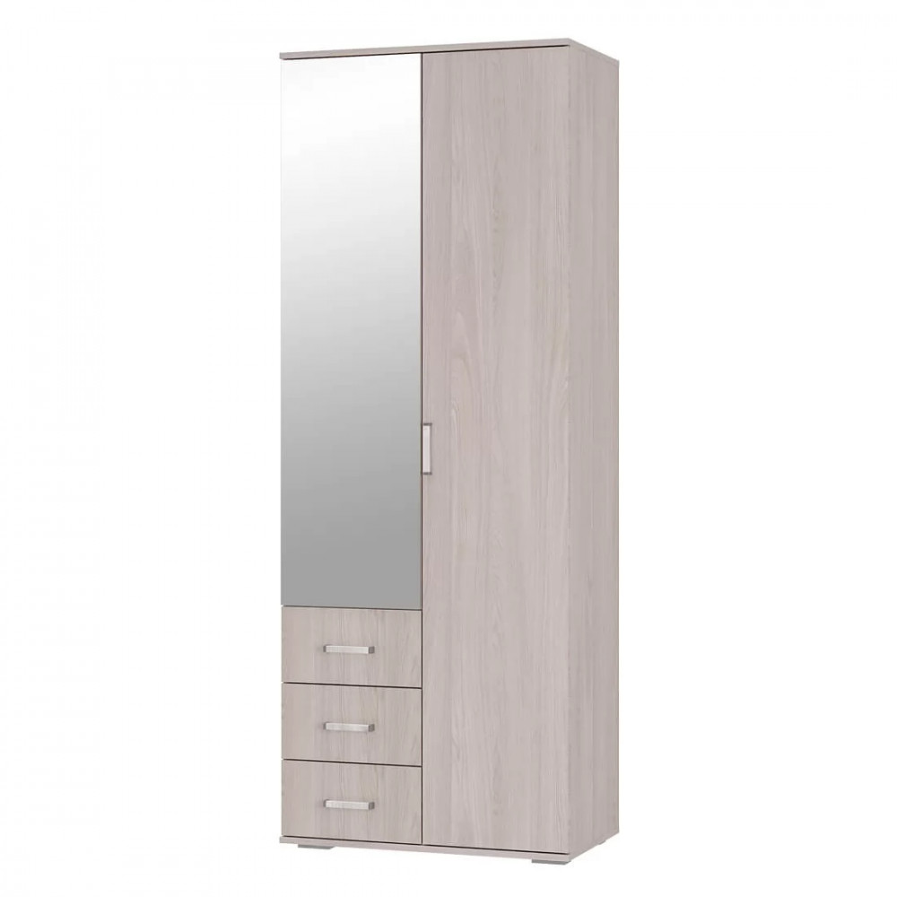 - модель имеет отделение с хромированной штангой для одежды на вешалках, - три выдвижных ящика для белья и аксессуаров, а также верхнюю полку, - на один из фасадов прикреплено высокое зеркало, - изделие выполнено из ЛДСП контрастных цветов венге и дуб аталанта, а также дополнено эргономичными ручками.