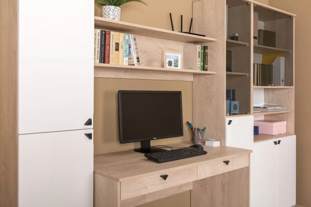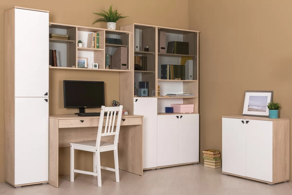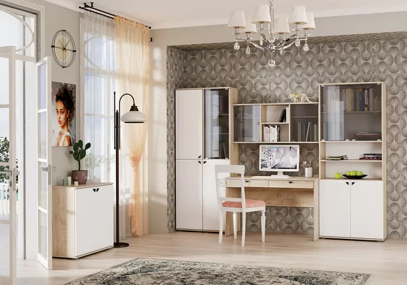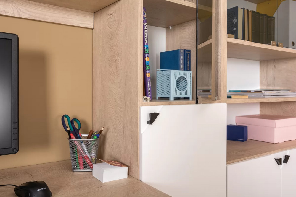 Модульная система Бостон предназначена для организации удобного и функционального рабочего пространства в современных интерьерах. Набор модулей позволяет собирать различные по размеру и стоимости компоновки, способные удовлетворить любой потребительский запрос. Минималистичная лицевая фурнитура выполнена в виде чёрных уголков-треугольников, которые чётко видны на белых фасадах и устанавливаются в специально выполненное углубление. Фасады выполнены из прочного и экологичного МДФ в плёнке ПВХ с тактильно приятным покрытием софт-тач. Витринные створки оформлены серым тонированным стеклом, открываются с помощью толкателей push.