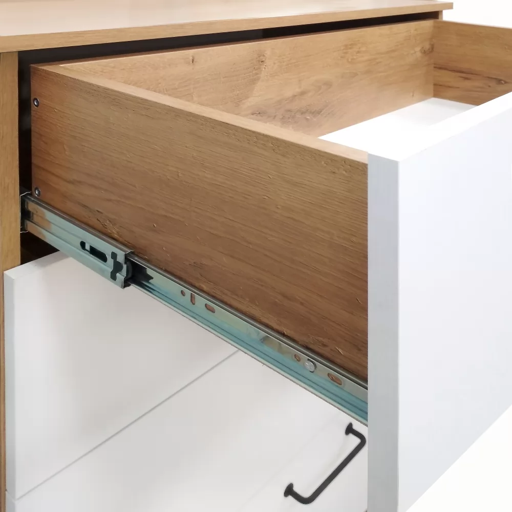 Классический комод - красивый и практичный. Выкатные ящики работают на шариковых направляющих полного выдвижения - тихие, надёжные, позволяющие увидеть и использовать всё пространство ящика. Сеул - смелая претенциозная коллекция для яркого и неповторимого дизайна вашего дома. Контрастное сочетание белоснежного цвета и богатого древесного оттенка делает интерьер современным, стильным и свежим.