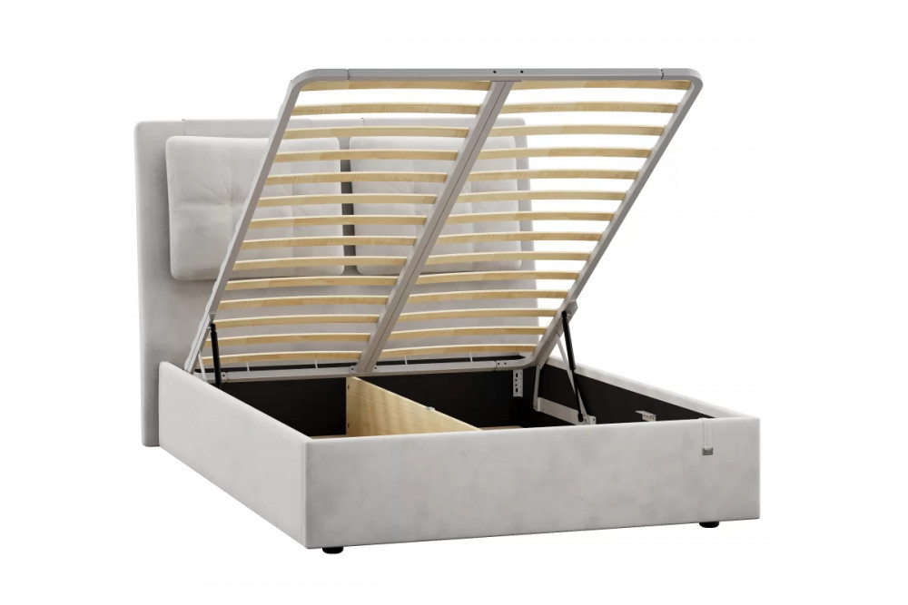 Подъемный механизм легок в управлении, а вместительный короб внутри кровати подойдет для хранения подушек, белья и других вещей.