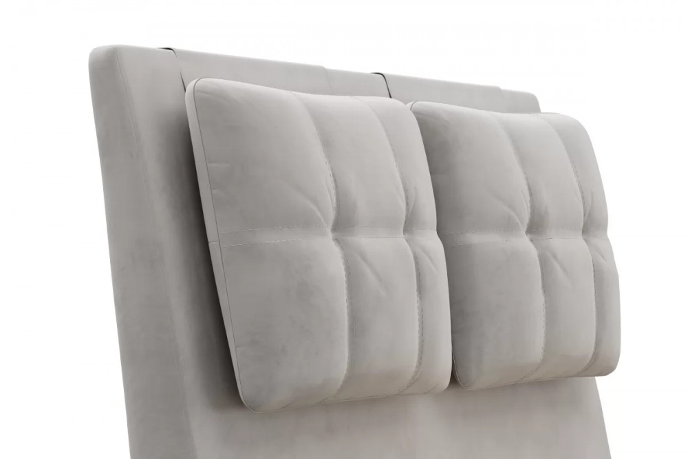 Кровати выполнены в нейтральных и в ярких тканях велюр, что позволяет подобрать подходящий вариант почти под любой интерьер. В качестве декора применяются декоративные подушки на изголовье.