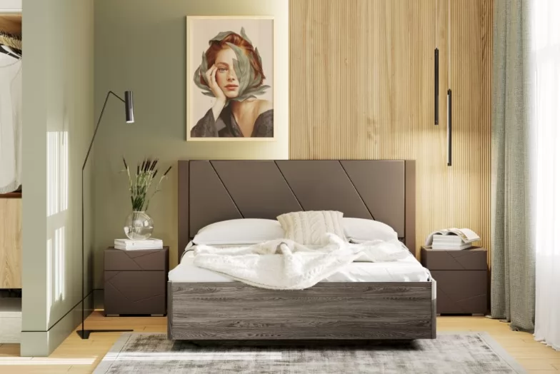 Характерной чертой дизайна коллекции «SUMMIT» является асимметрия из прямых линий. Сочетание фактуры колотого камня с ярко выраженной текстурой дерева. Такая мебель универсальна и подойдет интерьерам в стилях эко, скандинавский, минимализм или лофт, в его более легком варианте.  Спальня будет гармонировать с темными оттенками пастельных тонов, например, коричневым или серым. Если же добавить контраста — нужно выбирать для декора приглушенные холодные оттенки, например, синий или зеленый. Спальня «SUMMIT» понравится как современным жителям мегаполиса, так и тем, кто живет за городом. Мебель будет смотреться особенно гармонично на контрасте с фактурными отделкой стен. Оригинальное основание кровати, с эффектом «парения», станет изюминкой интерьера. Элементы изголовья кровати обтянуты мягким кожзамом. Мягкое изголовье обеспечивает комфортный и безопасный отдых.