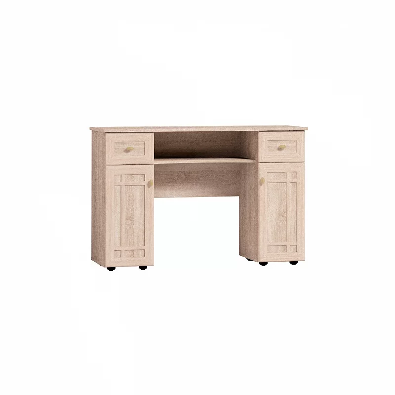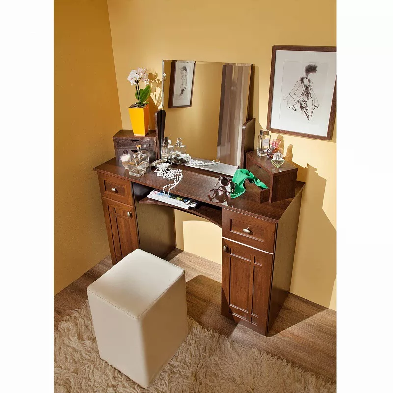 Организация пространства спальни часто упирается в необходимость увеличить проходы между кроватью и другими предметами мебели. Облегчить эту задачу сможет неглубокий (всего 40 см) туалетный столик. Благодаря широкой столешнице за ним можно удобно расположиться, чтобы сделать макияж. Спрячьте в выдвижные ящики разные мелочи, и детские ручки не накрасят помадой обои. Количество ящиков можно увеличить: установить Sherlock 54 Ящики по бокам столешницы. За рамочными фасадами просторная ниша с полкой, регулируемой по высоте. Полка под столешницей с фигурным вырезом позволит комфортно сидеть за столиком человеку высокого роста. Сам по себе туалетный стол соответствует по высоте нормам ГОСТ и может использоваться как письменный или для работы с ноутбуком. Зеркало докупается отдельно